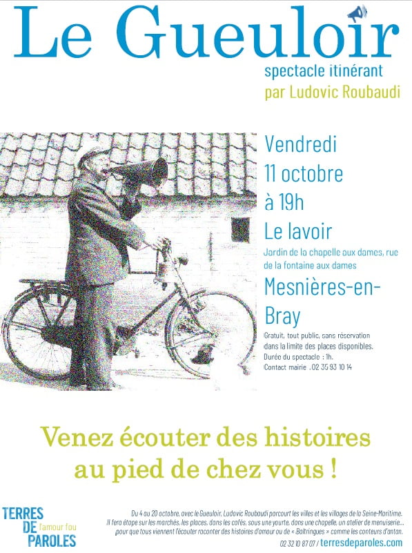 Avec le Gueuloir, il s’en va parcourir le territoire de la Seine-Maritime, sur les marchés, au café du coin, dans les granges, les collèges... pour raconter des histoires, partager le plaisir des mots et le bonheur de renouer avec l’imaginaire.