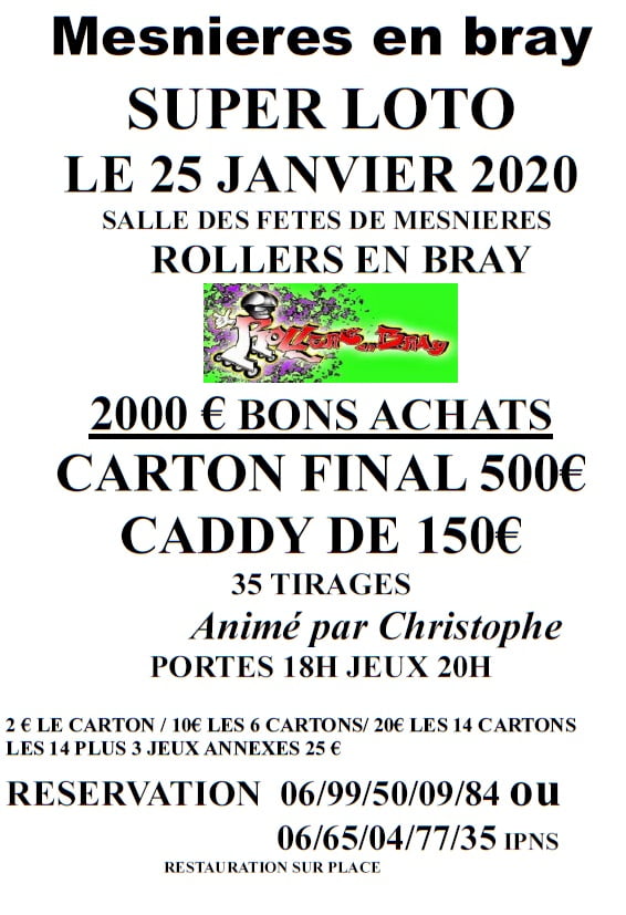 Le 25 janvier 2020, à partir de 18h, super Loto organisé par "Rollers en Bray"