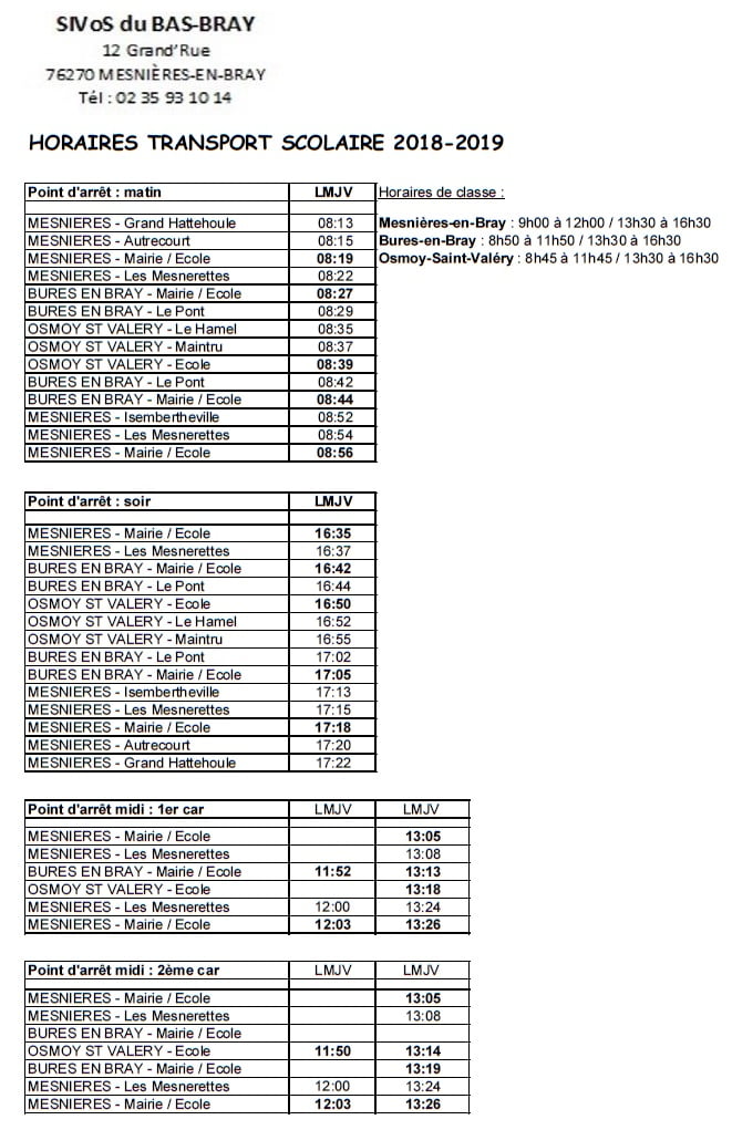 Vous trouverez ci dessous les horaires du transport scolaire avec le nom des arrêts et les heures de passage.